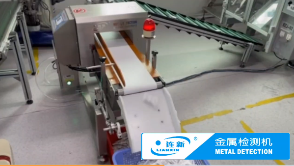 翻板剔除型金檢機加裝斜坡提升機,可對接包裝機,檢測到金屬后翻板自動剔除不合格產品。