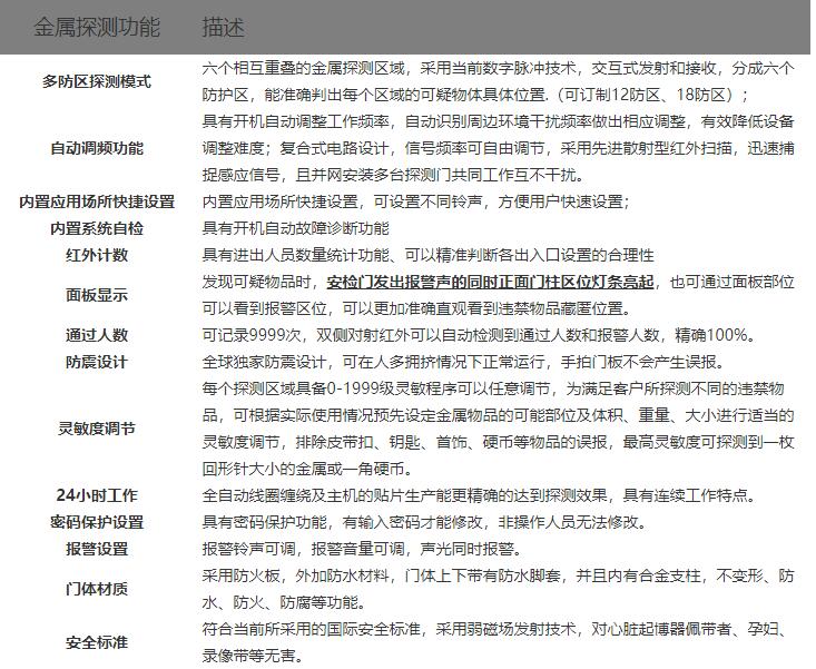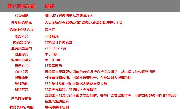 遠(yuǎn)距離高精度人體測(cè)溫安檢門,集帶人體溫度檢測(cè)和金屬探測(cè)為一體的安全檢測(cè)門,門頭裝有高精度的體溫檢測(cè)探頭,探測(cè)角度可以上下移動(dòng), 能夠測(cè)量人體額頭的表面溫度,然后根據(jù)人體額頭的溫度與體溫的關(guān)系得到人體的實(shí)際體溫。檢測(cè)儀的光學(xué)組件將額頭發(fā)射和反射的能量匯集到傳感器上,通過電子組件將此信息轉(zhuǎn)化成溫度讀數(shù)并顯示在顯示面板上,當(dāng)溫度讀數(shù)超過高溫報(bào)警值時(shí),儀器會(huì)發(fā)出報(bào)警聲.報(bào)警溫度可隨意設(shè)置.具有防水、防火、防腐等特點(diǎn)。適用于管制刀具和槍支等危險(xiǎn)品的安全檢查,廣泛應(yīng)用于適用于機(jī)場(chǎng),車站,出入境檢查站,等人員密集場(chǎng)所。是防止疫情擴(kuò)散的有效手段。