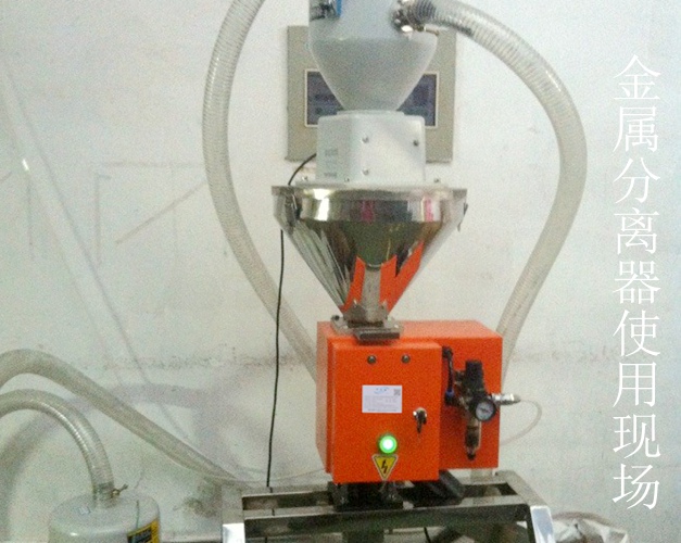 原料從料斗或送料器自由下落進入金屬分離器,如果沒有金屬雜質,原料會直接通過金屬分離器流向下端的出料口。如果檢測器檢測到原料中含有金屬,那么控制器立刻啟動分離板將金屬物和部分原料一起導向側面的排料口,然后分流板迅速恢復至正常的位置,分流板速度可調,金屬分離器的檢測精度也可根據生產需要調節,最小可檢測并分離出Φ 0.2mm的金屬顆粒。